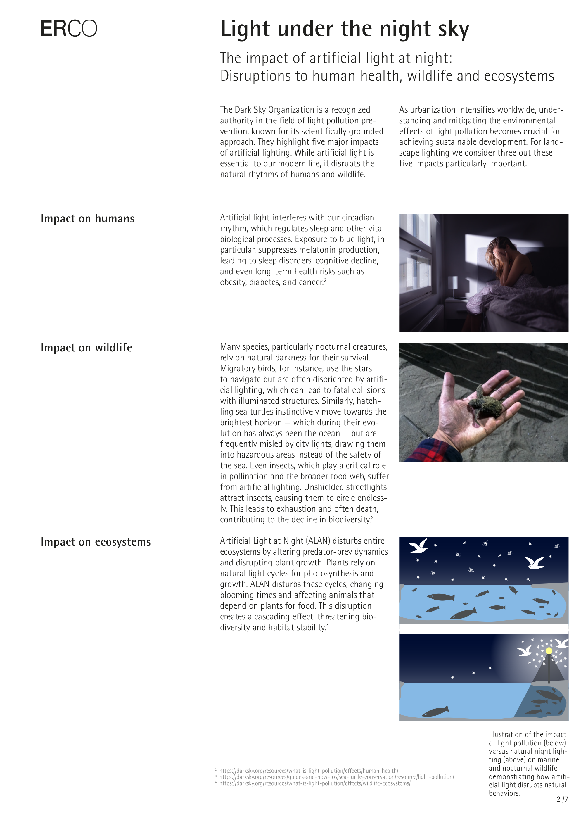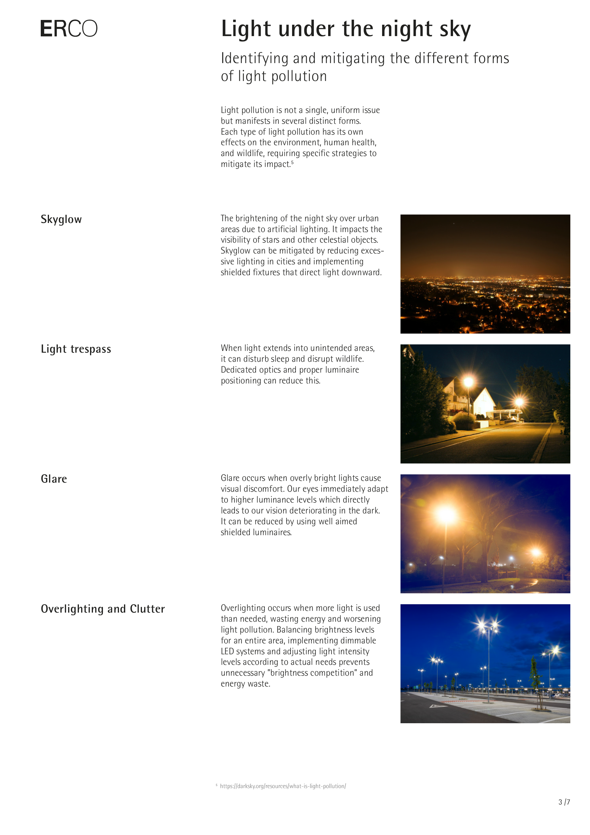 This ERCO whitepaper highlights the significant impact of light pollution caused by artificial lighting, affecting human health, ecosystems, and the night sky's natural beauty. It emphasizes the need for thoughtful lighting design to balance safety and visibility with environmental responsibility. The paper outlines five principles for responsible outdoor lighting, including using light only when and where it is needed, minimizing light levels, employing warm light colors, and integrating adaptive systems.